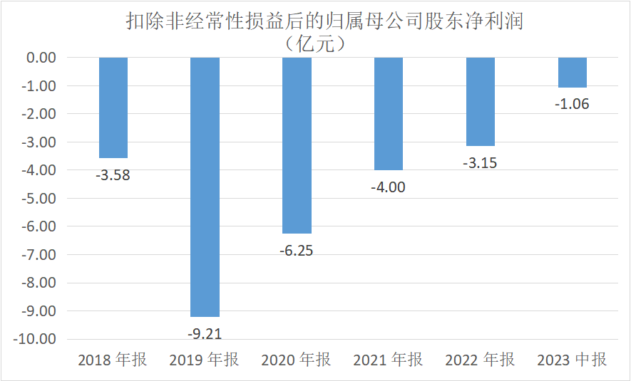 具体来看,2018-2022年末以及2023年6月末,翰宇药业归属于上市公司股东的扣除非经常性损益的净利润分别为-3.58亿、-9.21亿、-6.25亿、-4.00亿、-3.15亿以及-1.06亿。