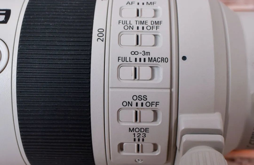 FE 70-200mm F4 Macro G OSS II还配有众多的独立功能按钮,摄影师能够迅速调整镜头工作状态,免去繁琐的设置。从上至下分别为:AF/MF对焦切换、全时手动对焦开关、对焦范围切换、防抖开关、防抖模式选择开关。