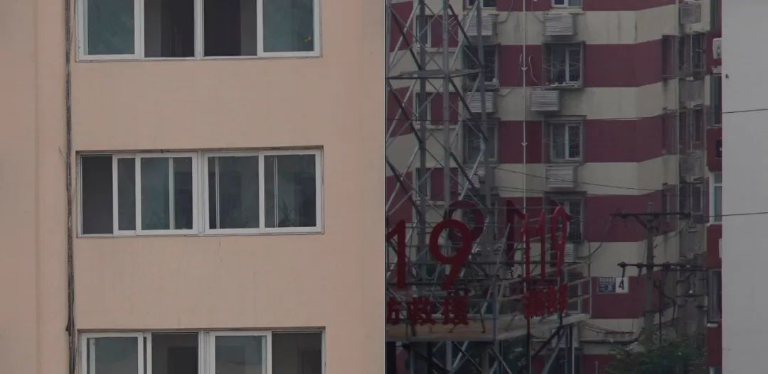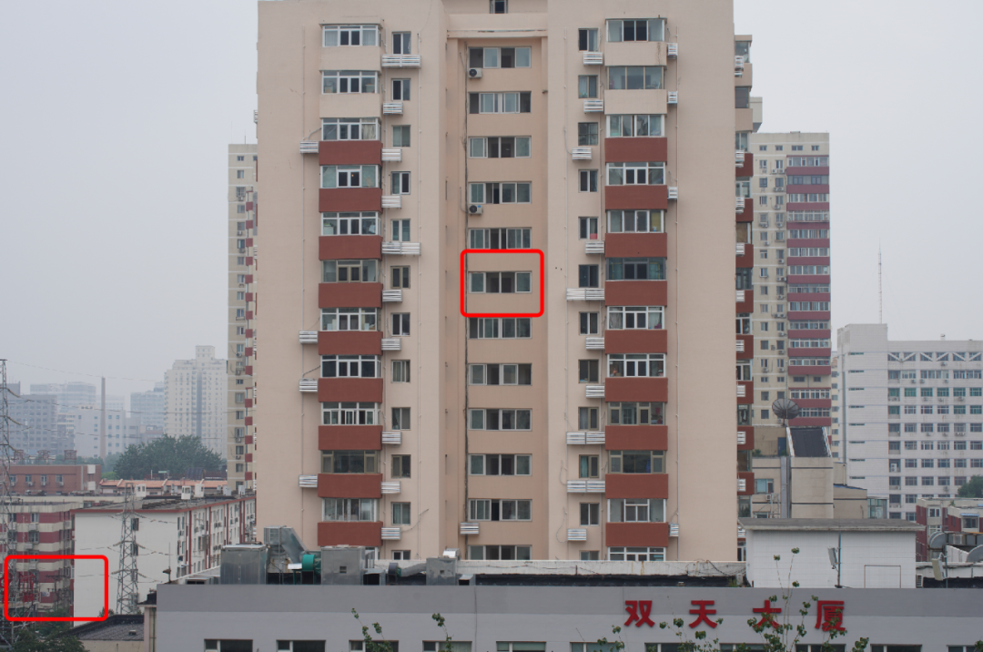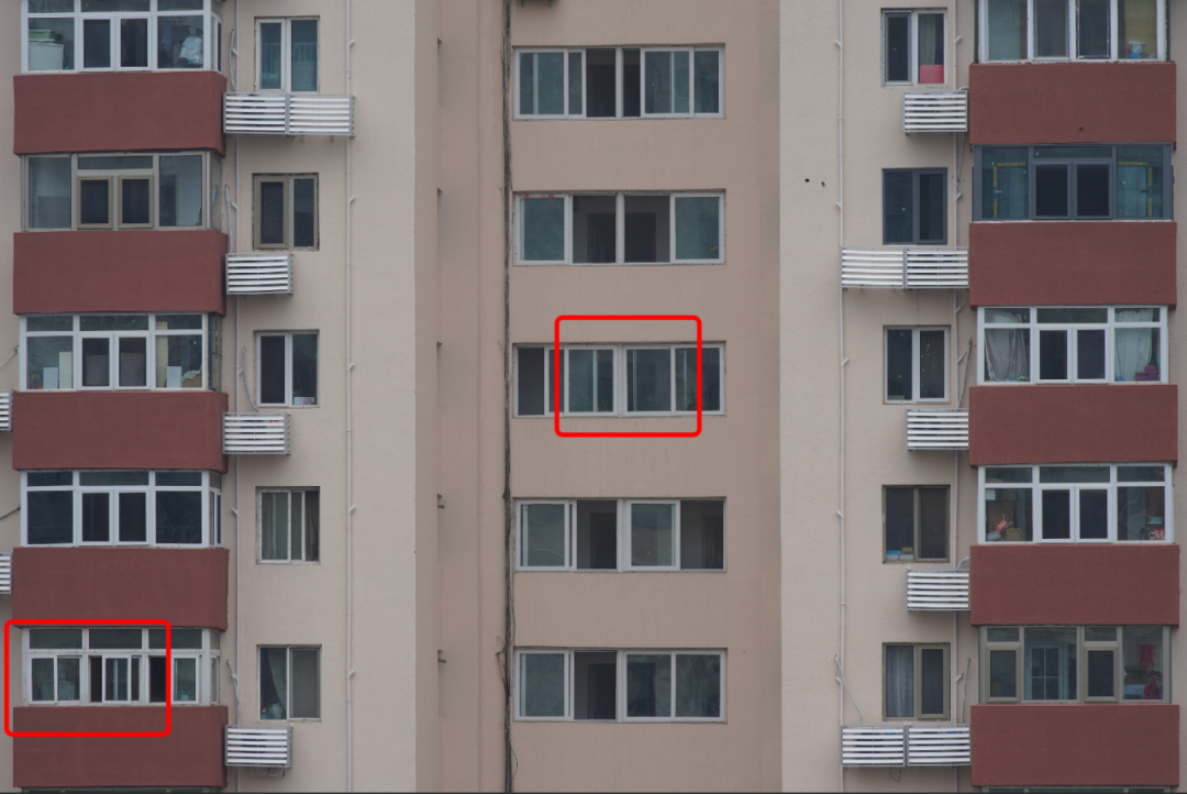 锐度测试中,笔者选择了无限远拍摄距离,并对原图中对红框处进行100%放大。(图左为中心部分,图右为边缘部分)