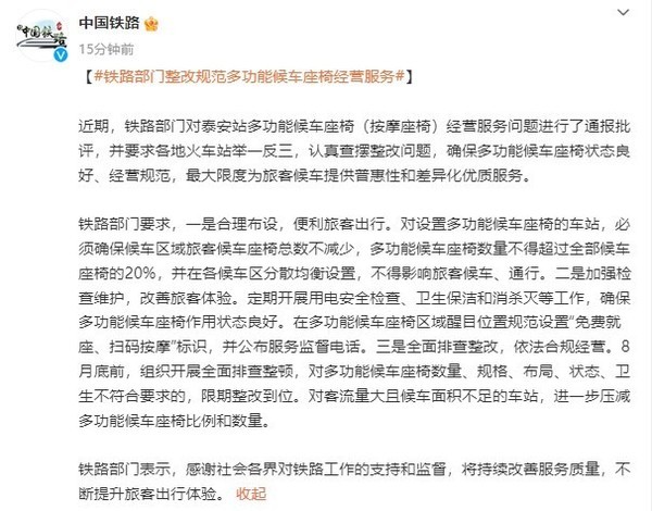 中国铁路表示,近期,铁路部门对泰安站多功能候车座椅(按摩座椅)经营服务问题进行了通报批评,并要求各地火车站举一反三,认真查摆整改问题,确保多功能候车座椅状态良好、经营规范,最大限度为旅客候车提供普惠性和差异化优质服务。