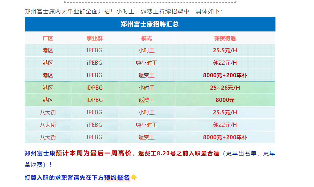 鞭牛士 8月17日消息,“郑州富工联招聘”微信公众号发布招募信息,高价延期,郑州富士康26元/小时,或者返费8000元招聘(返费条件包括一定在职时长/打卡天数)继续。招聘海报显示,8月4日,企业官方公布告知市场:今年市场最高价已敲定,并且消息很快传播河南市场。