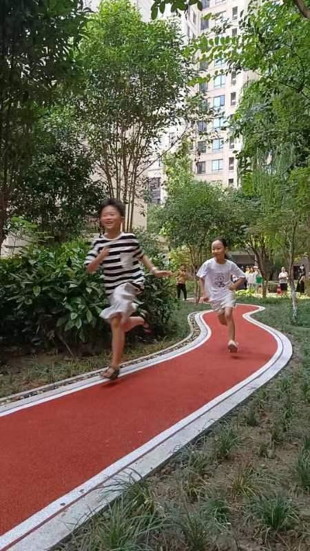 褚红色的塑胶跑道镶着白边,一眼望去,路面平整,色彩鲜亮,整体环境干净整洁,四周绿植繁茂,形成了一道亮丽的风景线。同时,健身步道采用沥青材质铺底,防滑性的材质充分保障了大家运动的安全性和舒适性。不论是散步休闲,还是运动遛娃都很惬意,极大程度上提升了运动健身环境。