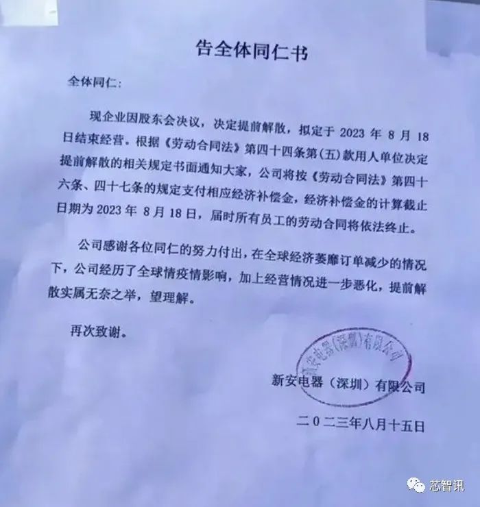 8月15日,成立38年的新安电器(深圳)有限公司(以下简称“新安电器”)发布“告全体同仁书”称,“在全球经济萎靡订单减少的情况下,公司经历了全球疫情影响,加上经营情况进一步恶化”,经股东会议决议,决定提前解散,拟定于2023年8月18日结束经营。