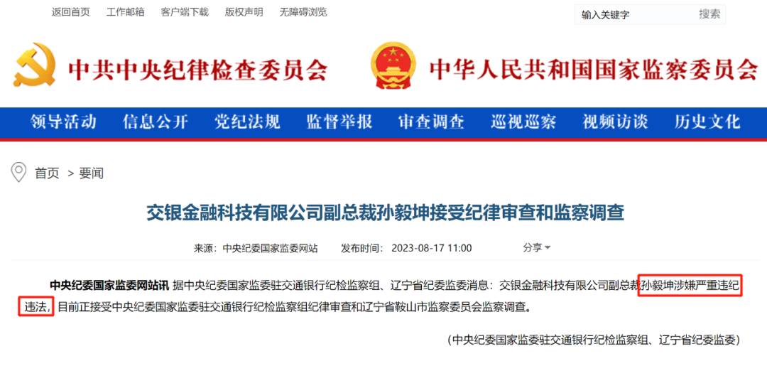 8月17日11点,中央纪委国家监委官方网站发布通告显示,据中央纪委国家监委驻交通银行纪检监察组、辽宁省纪委监委消息:交银金融科技有限公司副总裁孙毅坤涉嫌严重违纪违法,目前正接受中央纪委国家监委驻交通银行纪检监察组纪律审查和辽宁省鞍山市监察委员会监察调查。