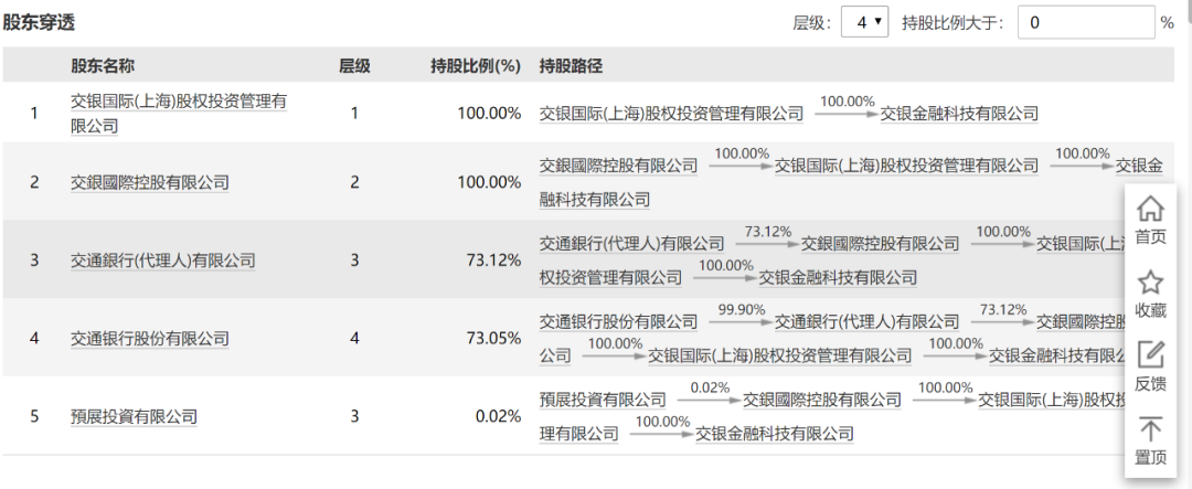从Wind数据显示的股东穿透信息来看,交通银行股份有限公司通过持有交通银行(代理人)有限公司-交银国际控股有限公司-交银国际(上海)股权投资管理有限公司,最终持有交银金融科技有限公司。