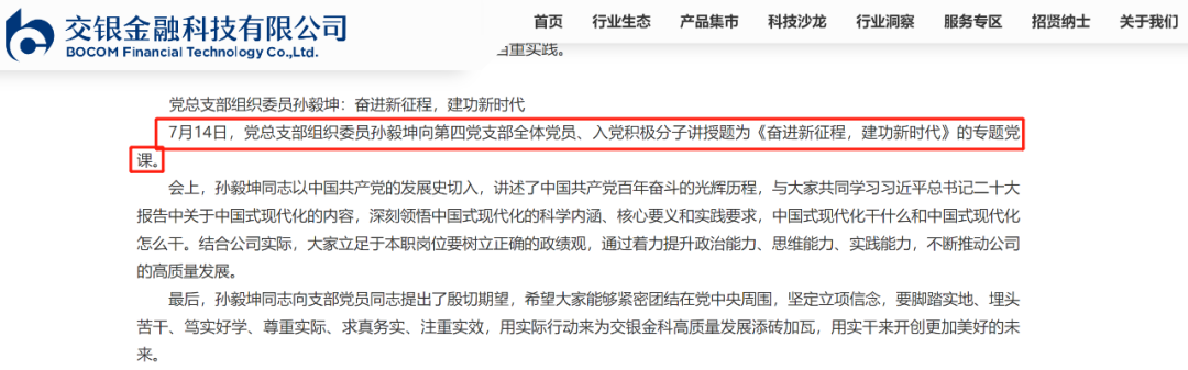 交银金融科技有限公司(以下简称:交银金科)官网于8月11日发布了题为《交银金科党总支部班子成员讲授专题党课》的文章。文中显示,7月14日,党总支部组织委员孙毅坤向第四党支部全体党员、入党积极分子讲授题为《奋进新征程,建功新时代》的专题党课。