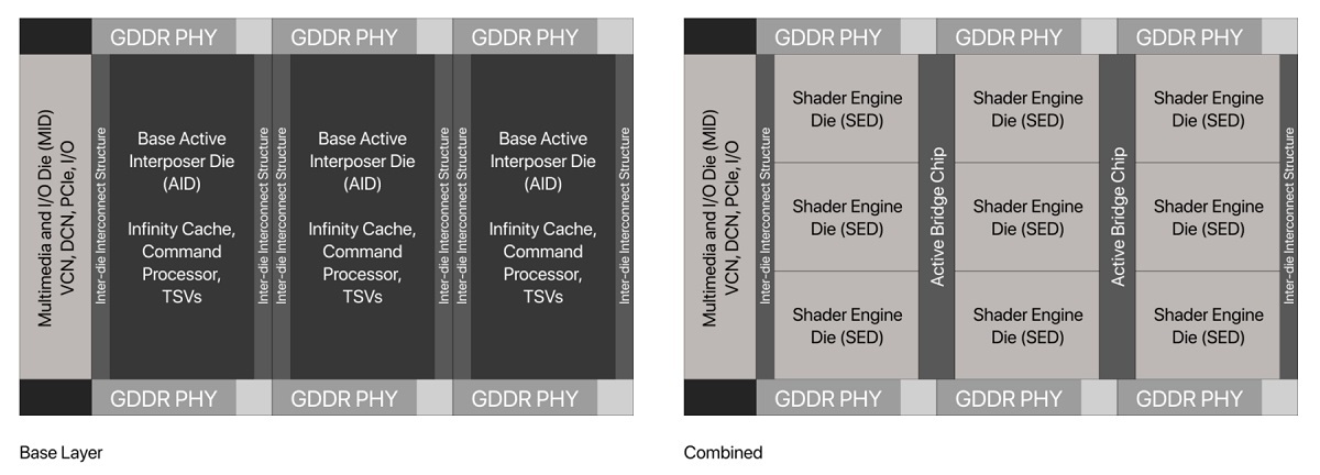 按照之前分享的信息,新款芯片主要由三个部分组成,分别是AID(Active Interposer Die)、SED(Shader Engine Die)和MID(Multimedia and I/O Die)。其中三个AID和一个MID会在底层模具上,通过芯片到芯片的互连方式实现互联,而SED则会以三个为一组安装在AID,也会通过相同的互连结构连接。