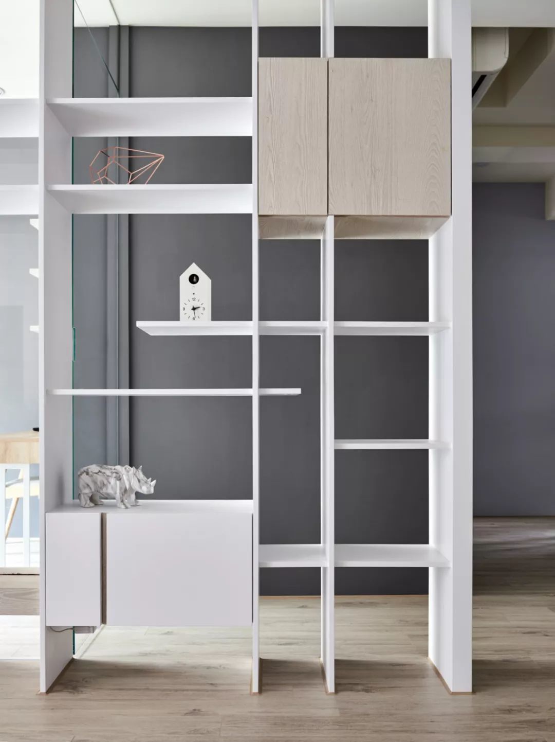 ▲在镂空电视墙后方,设置了一张书桌,上方装一个简易的书架,以灰色的墙面空间,为主人营造了一个简约实用的工作加班空间,得益于镂空的电视墙设计,也让这个小工作区有了明亮大方的空间氛围。