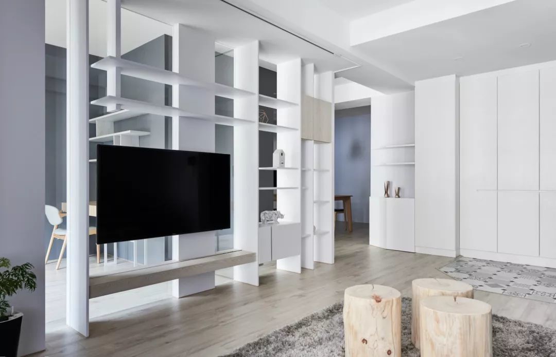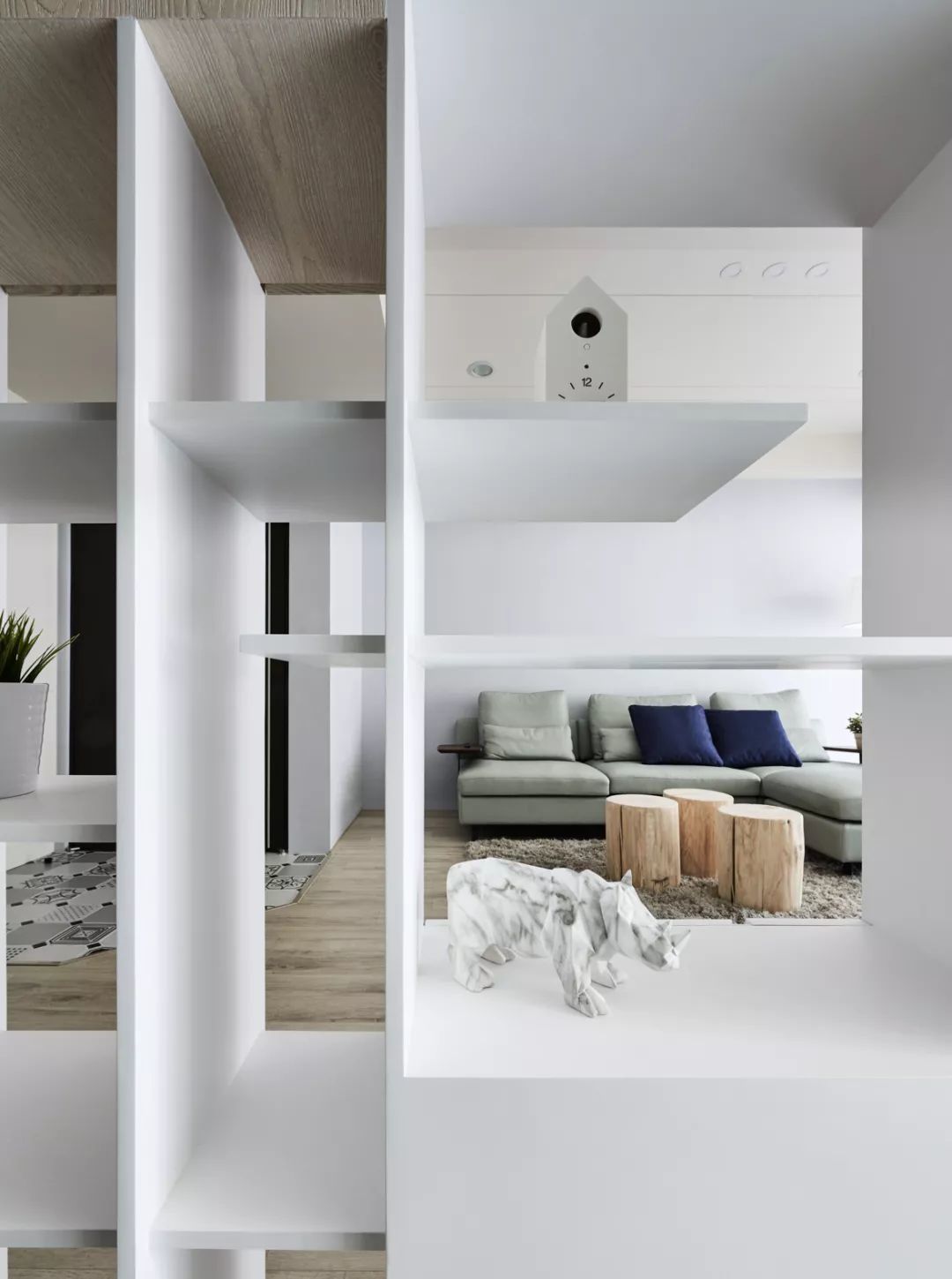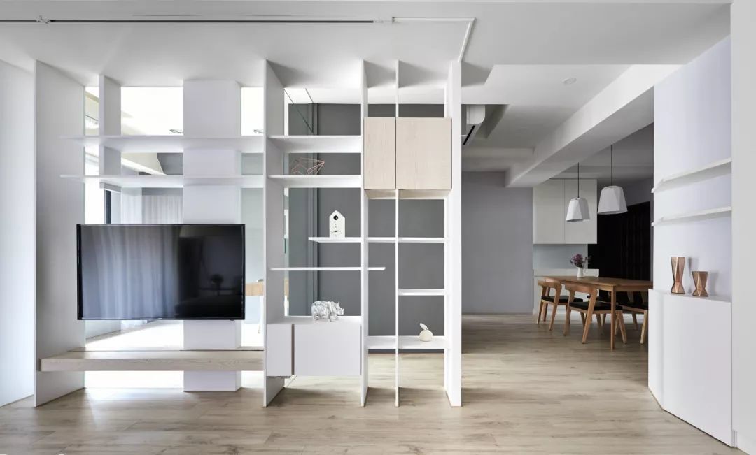 ▲镂空的电视墙收纳架,摆上时钟、金属摆件等小物件,也增添了空间的优雅文艺感。