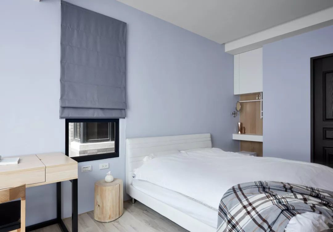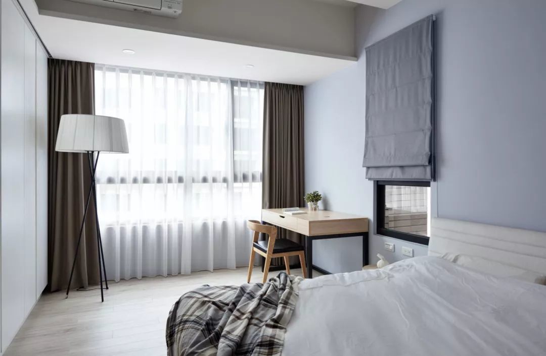 ▲布置一盏落地灯,为主人提供灵活方便的照明体验,床头与书桌之间,加入一个床头柜,上方还有一个小窗户,装上卷帘的设计,让空间显得简约实用而明亮大气。