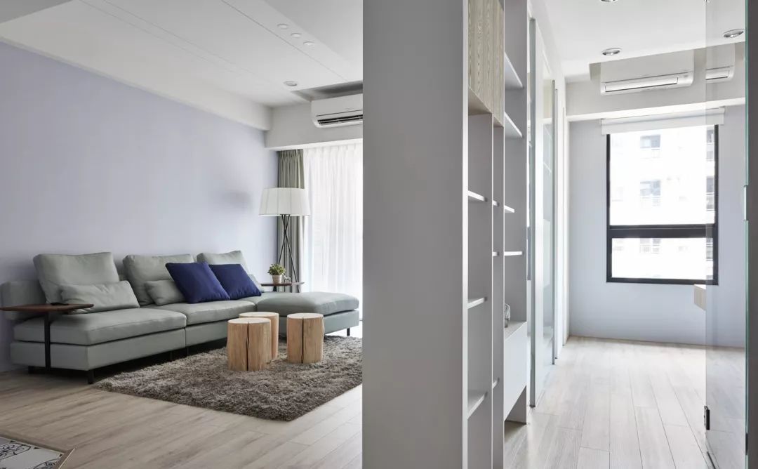▲沙发墙是淡淡的蓝紫色,搭配一张浅灰色布艺沙发,靠窗边上布置落地灯,加上3个木桩作为茶几,让客厅空间显得简约温馨而朴素大方。