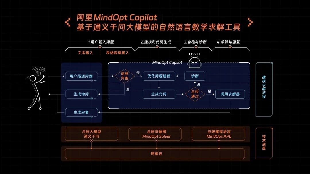 阿里云方面声称,MindOpt Copilot 基于阿里自研的大模型、求解器、建模语言“三大件”开发,借助底层的通义千问大模型,可将用户以自然语言描述的优化问题转化为线性规划和混合整数线性规划的优化模型,并获得最佳答案,比如“如何优化餐厅的座位安排”、“如何控制风险并最大化企业收益”或“鸡兔同笼”类问题。