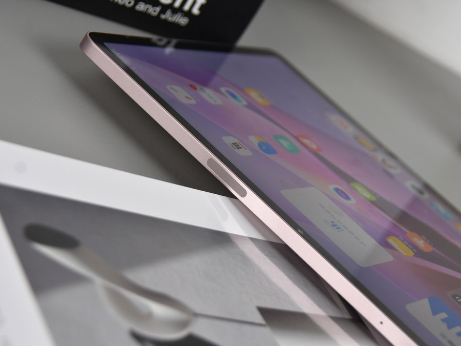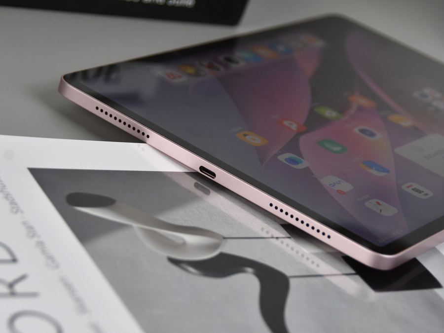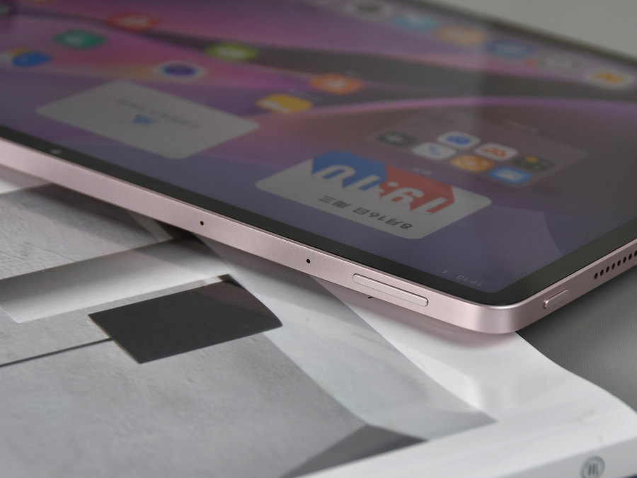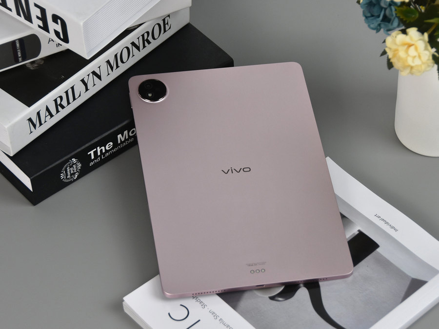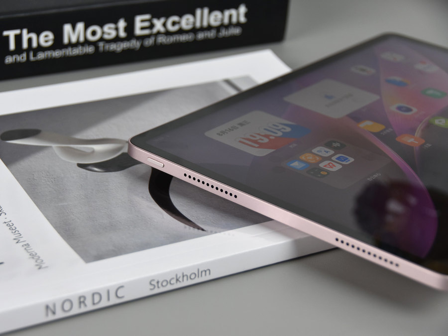 此次评测机的勇敢粉外观配色属于淡粉色,配合vivo Pad Air的金属一体化机身设计,整体无论是看上去还是摸上去都非常有质感。vivo自主研发的创新型谐振腔天线隐藏在全金属机身之下,兼顾高强度和轻薄设计之余也拥有更好的信号表现。