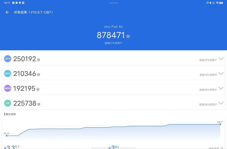 在安兔兔的跑分测试中,这款8+256GB存储版本的vivo Pad Air获得超过87万的成绩,性能依然不错。
