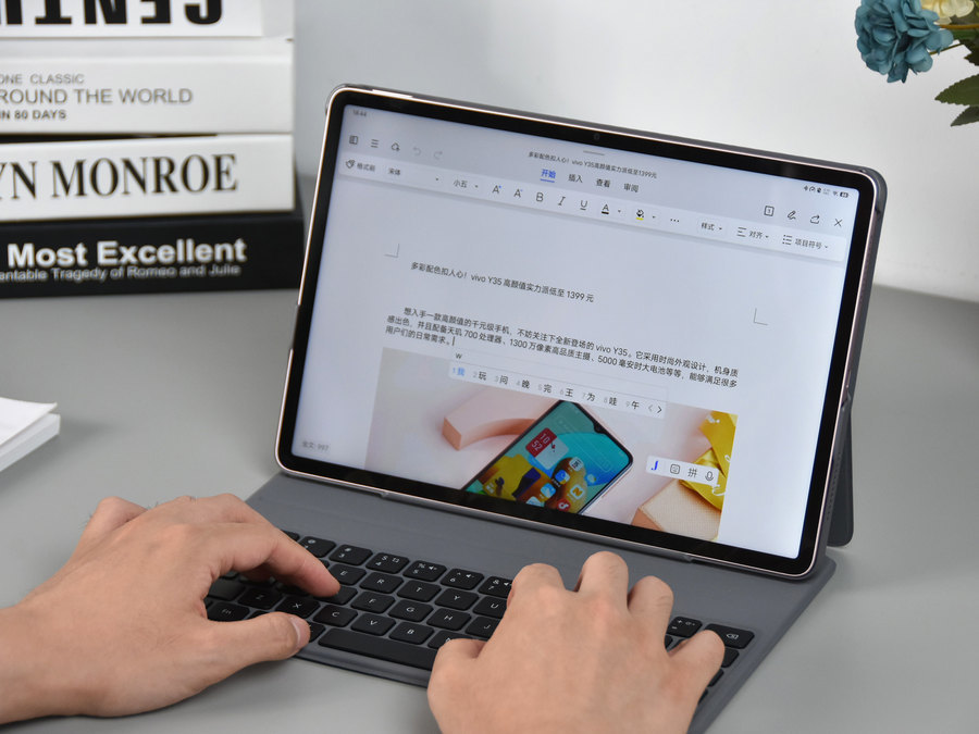 这款平板电脑还可支持vivo 智能键盘 Air。平板PC二合一,用户可随⼼切换使用。接上vivo 智能键盘 Air之后,与PC使⽤习惯保持⼀致,轻松上手。