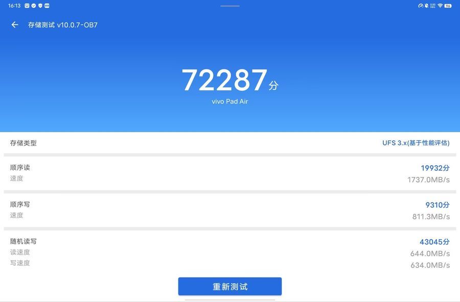 存储读取测试中,这款vivo Pad Air的顺序读取速度达到 1737MB / s,顺序写入速度达到811.3MB / s,表现也不错。
