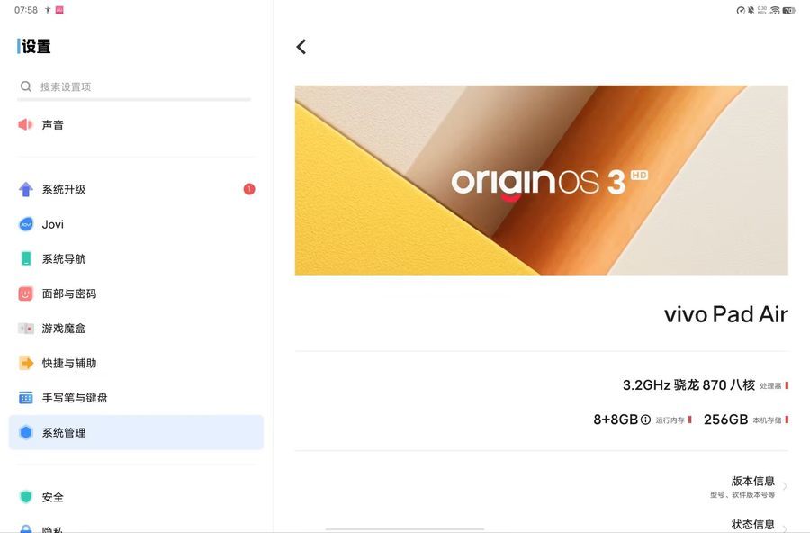 OriginOS 3 HD还拥有⾼效跨屏⽣态,能够令vivo Pad Air平板电脑与vivo自家智能手机进行高效的跨屏协作,成为用户更得心应手的生产力工具。