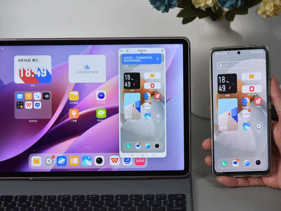 vivo Pad Air平板电脑采用自主研发的投屏协议,针对性优化数据传输信道,并能在平板上直接操控手机、相互拖放文件。从实际的体验来看,除了首次连接时需要一些操作步骤的等待时间,之后连接都非常的迅速顺畅。另外,无论是在手机上滑动操作还是在平板上,均没有感觉到有延迟的情况。