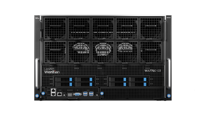 而联想问天WA5480 G3,则是一款具备多元化算力的4U机架式AI服务器,非常适合处理从机器视觉到复杂AI模型的多种应用场景。采用2颗第四代英特尔®至强®可扩展处理器,支持最新PCIe 5.0。通过PCIe扩展,最多可以支持10张包括最新NVIDIA H800 GPU在内的,多类型、多品牌AI加速卡。可以灵活应用于AI通用模型训练、大模型推理、AI生成、云游戏、科学计算等多种应用场景,为AI的多样场景提供多元算力。