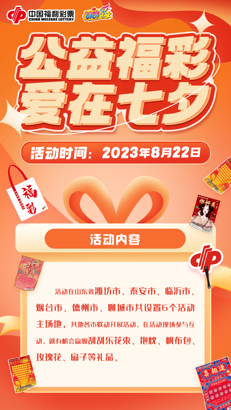 爱是三餐四季,爱是漫长岁月里的陪伴。七月初七,是中国的传统节日七夕节,是象征爱情的节日,是被认为中国最具浪漫色彩的传统节日。幸运与你相遇,共赴浪漫之约!在“七夕”这个甜蜜浪漫的日子,山东福彩为爱发声,于2023年8月22日组织开展即开票“公益福彩 爱在七夕”主题宣传推广活动,带你体验不一样的浪漫和幸福时光。