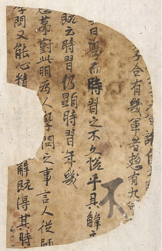 断片最多的是一组经义策问卷(图4),是唐朝学生写的作业,学生写好一题答案,空出一块留给老师写评语。细笔字迹是学生写的,粗笔字迹如“对”“通”“注虽得,错处大多”等是老师的评语。这组文书有十几件,内容涉及《论语》《孝经》《尚书》等唐朝学生学习的典籍。这些文书废弃后,家庭主妇废物利用,做成鞋底或鞋面,做葬具用品。其实它们对于研究唐朝的教育史,是很生动的材料。中国国家图书馆的刘波老师写过一篇文章《普林斯顿大学藏吐鲁番文书唐写本经义策残卷之整理与研究》,对此做了研究。