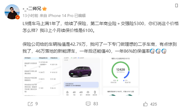 -博主@_-二师兄分享道:理想L9第二年商业险+交强险5300,自己的宝马i3续保价格是6100。
