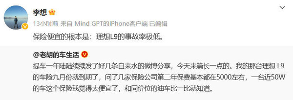 近日,智车派注意到,有网友发文表示,自己的理想L9车险九月份就到期了,问了几家保险公司第二年保费基本都在5000左右,一台近50W的车这个保险我觉得太便宜了,和同价位的油车比一比就知道。目前,理想汽车的首席执行官李想已经转发了相关消息并且表示,保险便宜的根本是:理想L9的事故率极低。