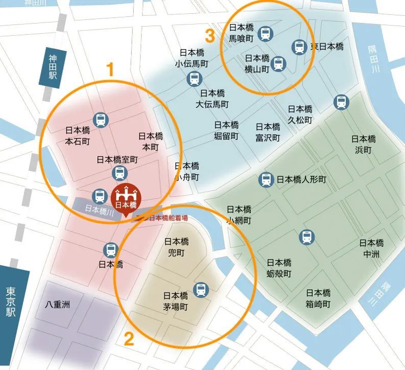 2.小型开发商平和不动产侧重于激发金融街活力而做的“兜町、茅场町再生计划”(集中在下图中2的位置);
