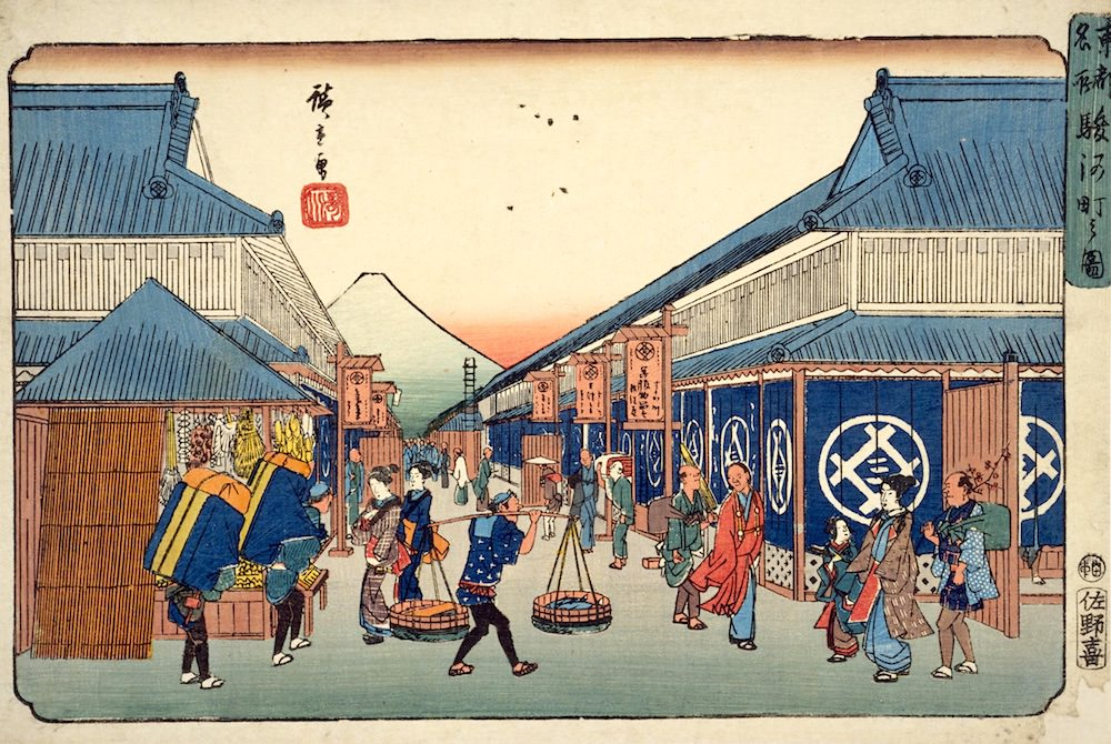 歌川広重《東都名所駿河町之図》,图中挂着蓝色暖帘的商店就是“越后屋吴服店” ©国立国会图书馆