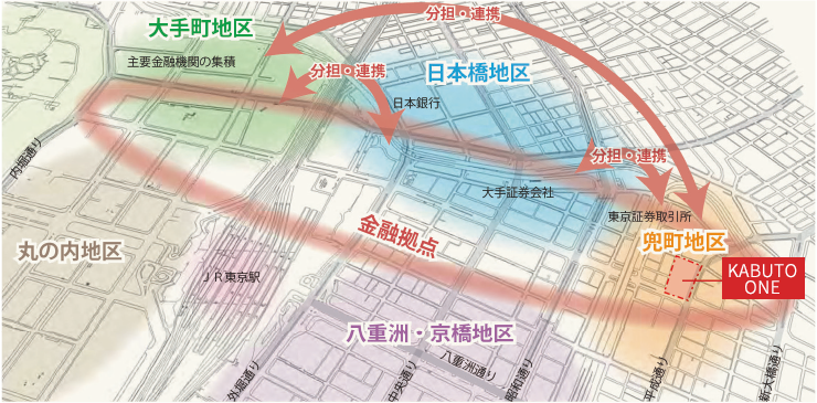 在这个大背景下,平和不动产积极发起了兜町及相邻的茅场町区域的再生计划。他们以“人的聚集、投资和成长的城市建设”为理念,重建兜町特色为目标,希望把兜町、茅场町区域打造成东京国际金融据点,通过阶段性开发引进金融相关功能,使这个区域承担“国际金融城市·东京”的一部分。