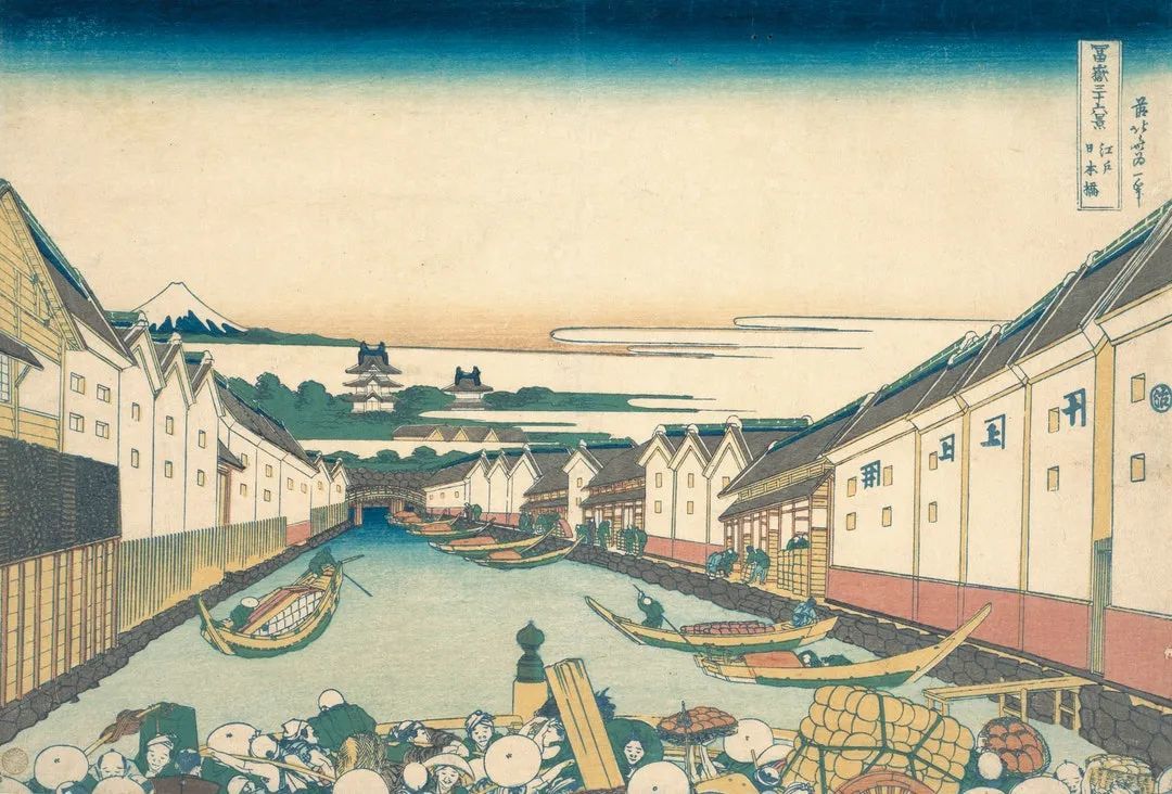 葛饰北斋笔下的日本桥、远处的德川幕府城堡和富士山〈富嶽三十六景 江戶日本橋〉©The Metropolitan Museum of Art