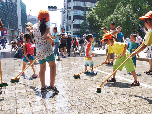 日本桥的夏季例行活动“洗桥”。当地居委会和周边企业等共同进行日本桥的大扫除。通过消防队的洒水车来高压防水,让本地区的孩子们也能一边清洁地面一边玩耍。©Nihonbashi Goyomi