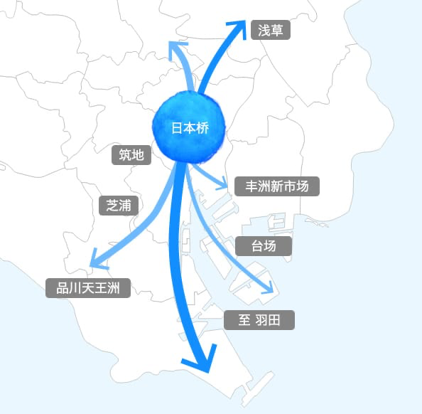 连接东京都中心与滨水区的船运网络。日本桥是距离东京站很近的都中心的船运网络据点。与羽田、台场、芝浦、晴海、丰洲、浅草等滨水区据点相连,作为观光和生活的交通路线,提供新的出行选择。©三井不动产