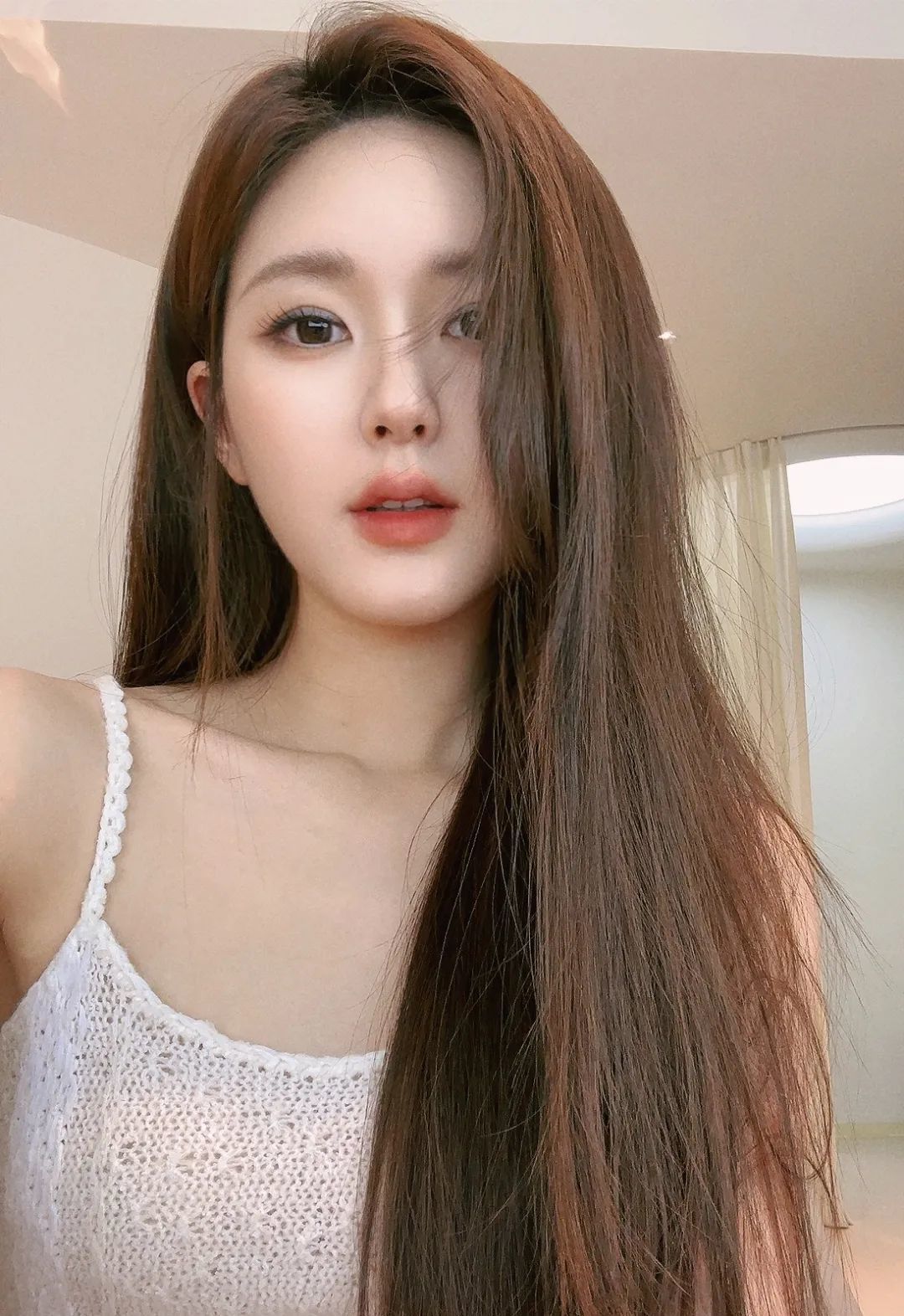 比如这张穿白色背心的自拍照,第一眼完全认不出是赵露思,仔细对比她在剧里的样子,会发现她把脸修小、修窄了一圈,从圆脸变成了鹅蛋脸;此外,鼻翼也修窄了,以至于鼻子看起来仿佛不能顺畅地呼吸。下这么重手修图,不像网红脸就怪了。