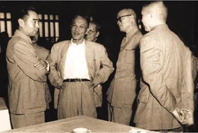 1955年6月,周恩来出席中国科学院四个学部的成立大会。会议休息时同周扬(右一)、范文澜(右二)、翦伯赞(右三)在一起交谈