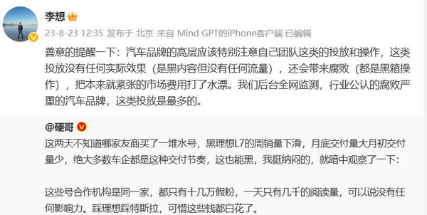目前,理想汽车的首席执行官李想已经转发了相关博主的消息并表示:善意的提醒一下,汽车品牌的高层应该特别注意自己团队这类的投放和操作,这类投放没有任何实际效果(是黑内容但没有任何流量),还会带来腐败(都是黑箱操作),把本来就紧张的市场费用打了水漂。我们后台全网监测,行业公认的腐败严重的汽车品牌,这类投放是最多的。