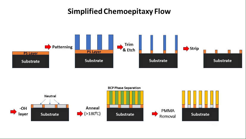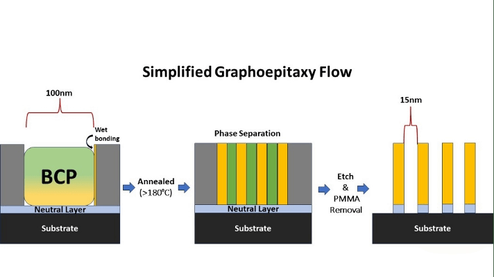 使用DSA对硅进行图案化有两种有效的方法——石墨外延流和化学外延流。石墨外延流使用传统光刻法对尺寸通常为最终CD尺寸的2倍至5倍的衬底进行构图。用BCP填充沟槽并退火(>180°C)以诱导相分离。沟槽的底部必须是中性的,以防止BCP粘附在基底上,同时一面墙与BCP湿结合。所得结构的CD由BCP链的长度定义(见图3)。
