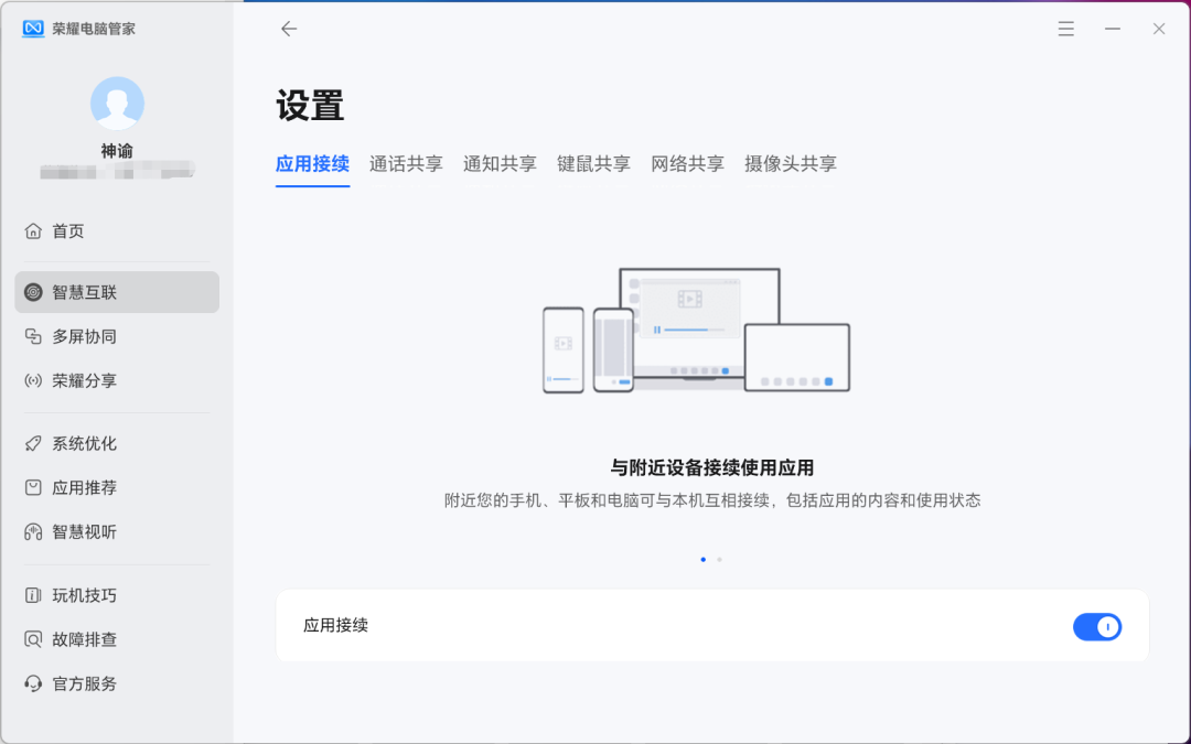 现在荣耀系手机、电脑和平板已经可以自动发现在附近登陆同一个荣耀账号的设备,支持键鼠互联、通话共享、网络共享等功能。