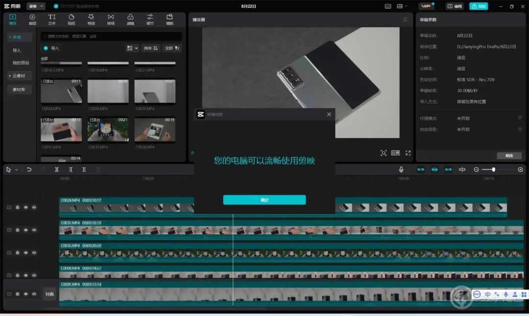 在视频处理方面,由于本人都是属于轻度需求,基本采用剪映就能满足操作。经过简单的测试,我们导入 20 个 4K 素材,拖选 10 个到剪辑轨道上,拖动和播放都很流畅,简单的特效、剪辑都没有问题,导出速度也让人满意。