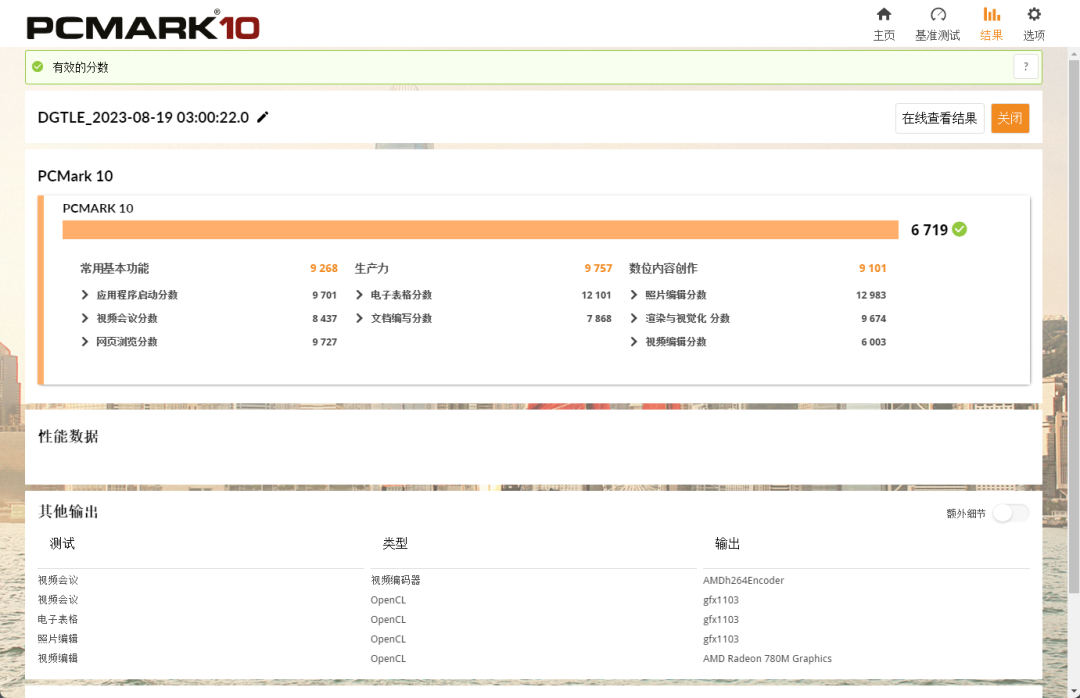 在办公整体性能测试 PCMark 10 中,荣耀 MagicBook X 14 Pro 也取得了 6719 的高分,其中生产力分数尤为突出。而英特尔版本,跑分大概在 5990 左右。