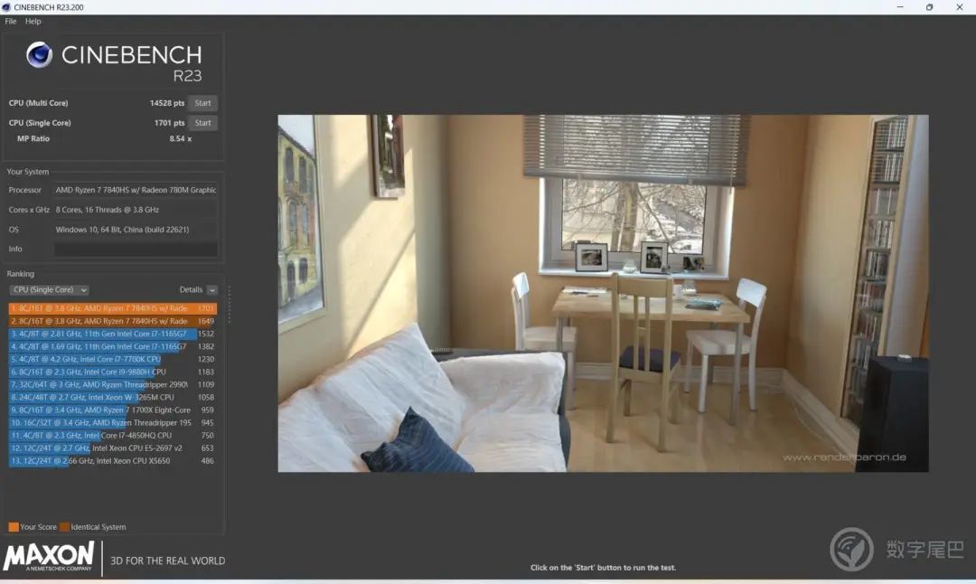 想要直观看到 AMD 7840HS 的具体性能,当然还是直接走一遍跑分比较实际。开启性能模式,Cinebench R23 测试中单核得分为 1701,多核为 14528。这个性能表现对于轻薄本领域而言已经非常优秀,其中的多核得分,比起 i5-13500H 常见的 13050 分还要高上不少。