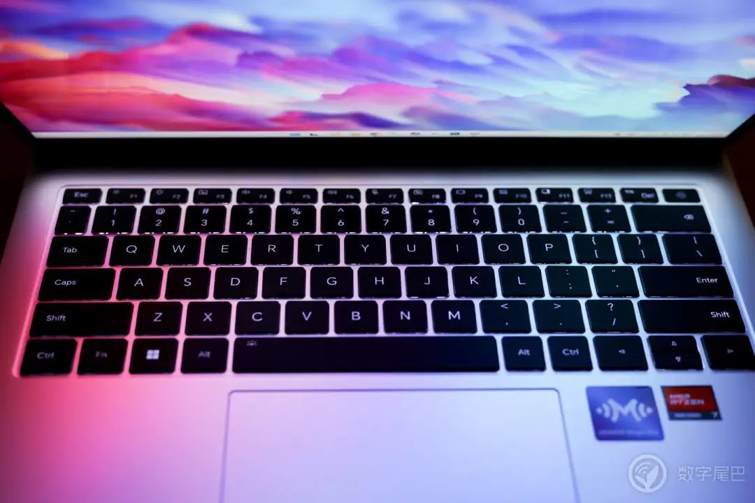 由于是轻薄本的关系,键程相对比较浅、手感软,不过足够大的键帽和键位间距还是能够带来不错的输入体验。键盘有三档背光 (关 - 低 - 高),背光均匀性还不错。
