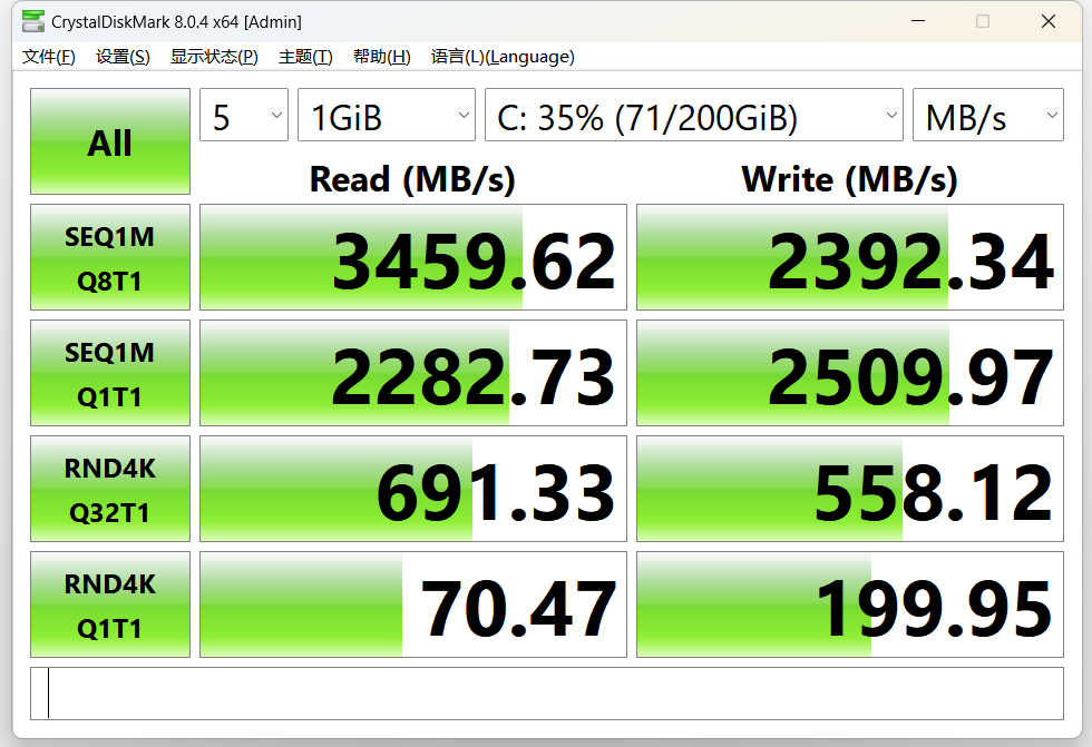 当然导出速度除了处理器性能之外,内存和 SSD 的性能也同样重要,锐龙版采用了美光 LPDDR5x 6400MHz 内存,铠侠 512GB SSD。固态读取速度可以达到 3459+MB/s,写入速度达到 2392+MB/s,对于这个价位的轻薄本来说非常满足了。