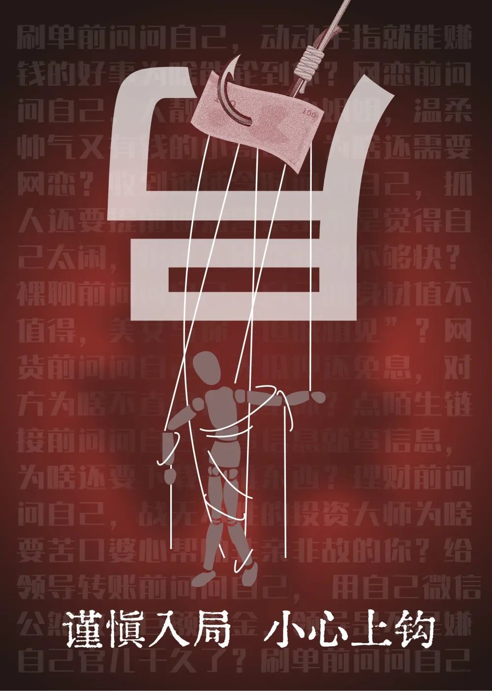 还有绘画插画风格海报《谨防电诈“诱饵”》,钱化身为恶魔到处放钩子,形象演绎故事。