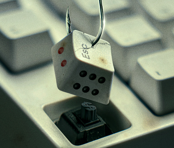 而Esc键盘大有文章,侧面印着骰子上的两点和六点,键帽下的黑色键是美元符号$;键盘旁隐隐散落着几滴斑驳的血渍,突出了以网络赌博为幌子的电信诈骗主题。