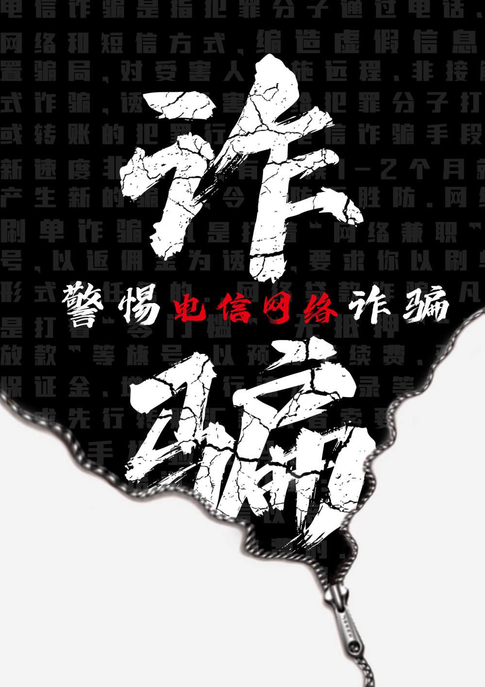 还有以拉链形式设计的海报,拉链里是黑色的背景和预防诈骗的信息,呈现网络诈骗的黑暗。