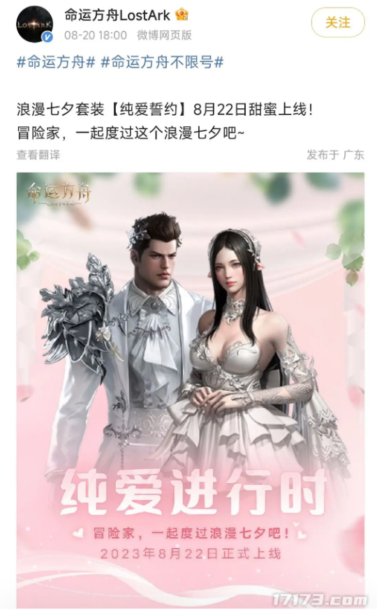 七夕节确实是进行商业活动的好机会,《命运方舟》同样也上线了七夕活动。通过参加活动,玩家能够获得一套婚纱礼服的时装,当然想要获得这套时装肯定是少不了氪金的,大约需要投入500左右的软妹币。
