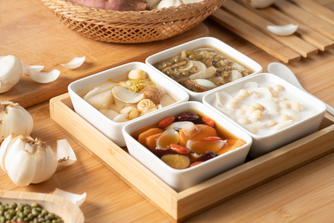 椰汁芡实百合,主治祛湿;莲子百合炖雪梨,清热润肺。这两碗非常适合应对“秋老虎”天气。后两碗添加红薯跟绿豆,分别搭配了红枣姜汁、陈皮,是非常经典的广式糖水,清热降火、润肺暖胃。