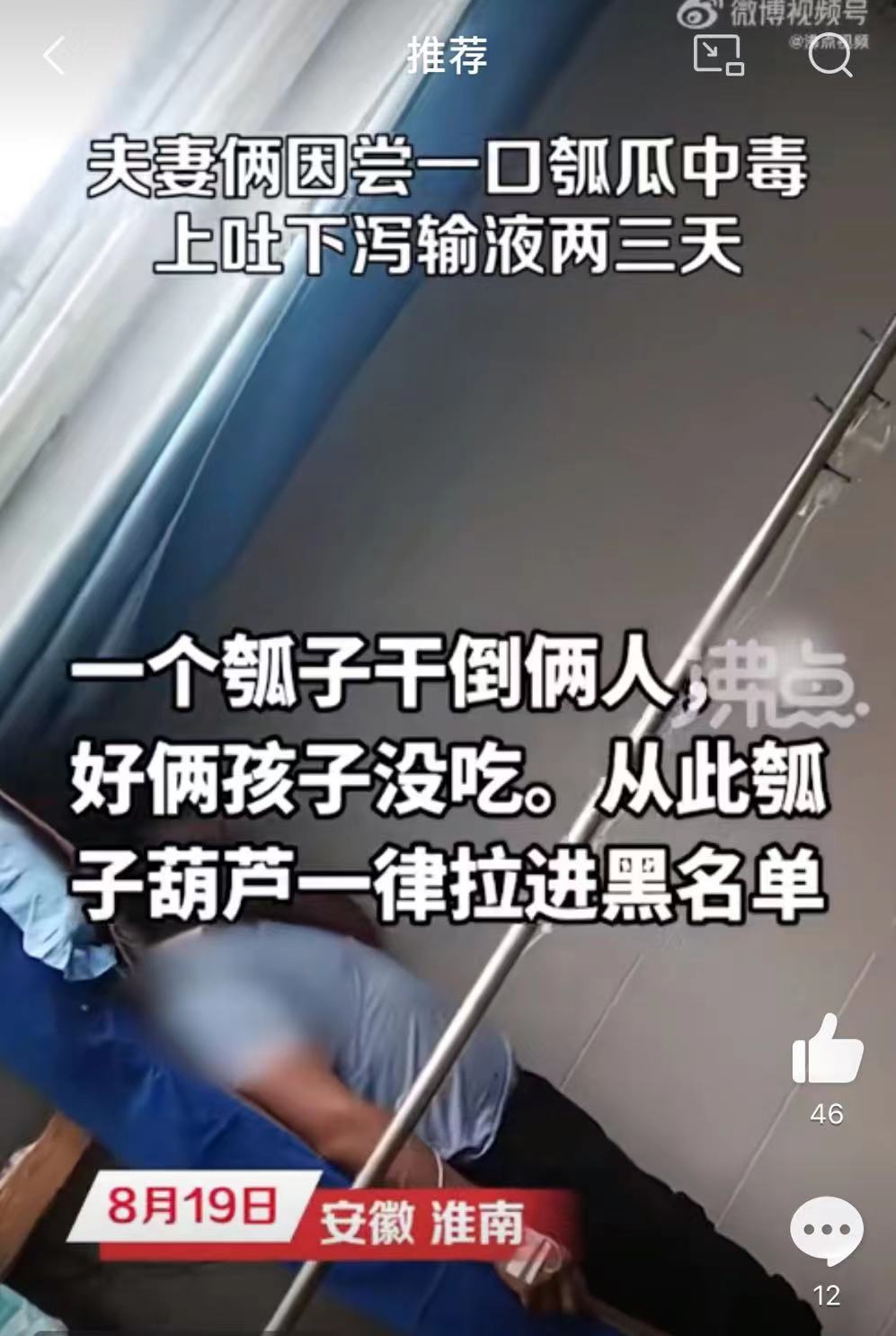8月19日,淮南一对夫妻因吃了一口瓠瓜而中毒就医。据当事人介绍:她用瓠瓜做丸子,尝了一口觉得有点苦,丈夫吃了一个也觉得很苦,就直接丢掉了,没有给孩子吃。不久两人就开始上吐下泻,丈夫吃得更多,症状也更重,两个人吃药输液两三天才恢复过来。据了解,瓠瓜是葫芦的一个变种,而苦葫芦中含有碱糖甙毒素,这种植物毒素加热后也不易被破坏,容易引起呕吐、腹泻等症状。如遇发苦的葫芦瓠瓜,请不要食用。