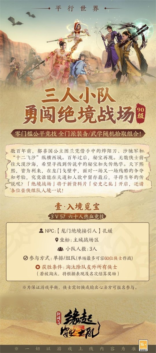 七夕周年双庆喜上加喜,龙门绝境争霸蓄势待发。《剑网3缘起》绝境战场将于新资料片“安史之乱”开启,六十人竞技战场节奏更快,技能装备随地捡,搭配使用新意十足,一场大漠对决即将拉开序幕,等待侠士们入境一试!龙门绝境全新资讯首爆,今日抢先一览!